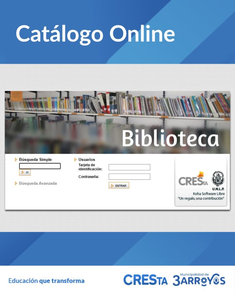 Catálogo Online: El Sistema de Gestión Integral de Bibliotecas KOHA-UNLP, permite realizar consultas sobre la colección que cuenta la Biblioteca desde el Catálogo Online (Click Aquí). El mismo es accesible para toda la comunidad, desde cualquier dispositivo móvil o PC, con conexión a internet, brindando distintas opciones de búsqueda y recuperación de información según las necesidades de cada usuario. Los usuarios asociados podrán renovar préstamos y reservar material ingresando a la interfaz de Usuarios.